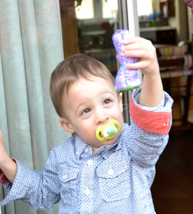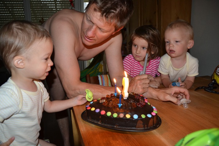Den Geburtstag haben wir aber nur ganz klein gefeiert. Die Mama hat einen super tollen Schokoladenkuchen mit Smarties und Gummibärchen gebacken. Am besten fanden die Jungs aber die Kerzen. Paul kann die schon auspusten, Luis mussten wir noch ein wenig helfen.