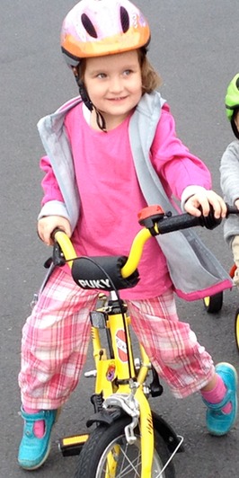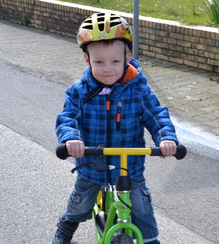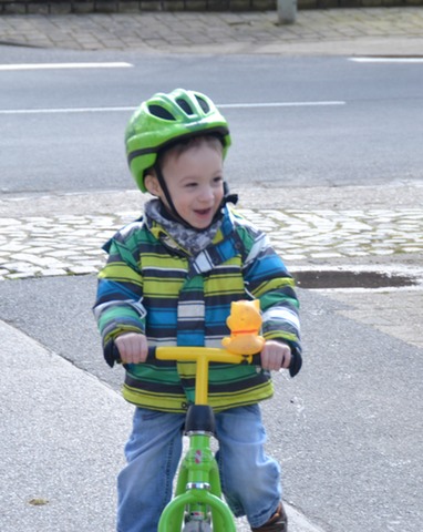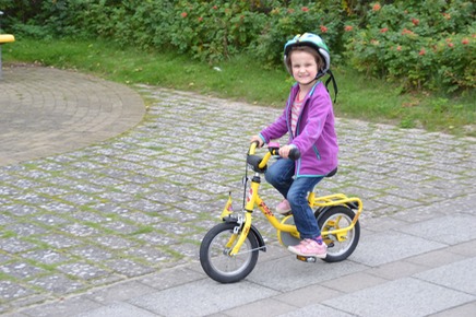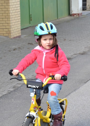 Ich fahre Fahrrad, wie ein Profi. Ich kann jetzt alleine anfahren, Kurven fahren und bremsen klappt auch super. Ihr solltet mir nur nicht auf meinem Weg begegnen, wenn es etwas zu gucken gibt, verliere ich leider die Straße aus den Augen und dann kann es schon mal glimpflich werden.