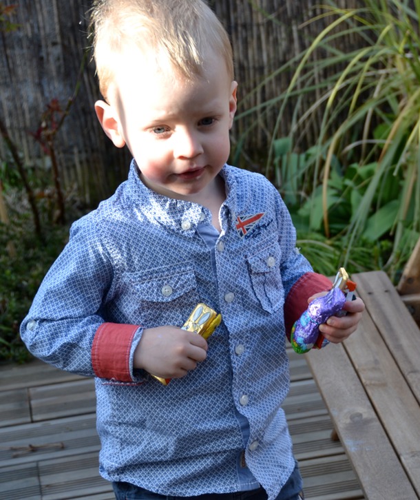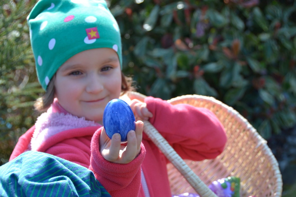 Überall hat er uns bunte Eier und Schokohasen versteckt und wir dachten auch wir hätten alle gefunden. Aber vor ein paar Tagen, hat die Mama den Garten auf Vordermann gebracht und da hat sie tatsächlich noch einen Schokohasen gefunden - der hat uns auch noch geschmeckt!