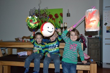 Seht mal wie toll unsere Laternen geworden sind. Ich hab meine ganz alleine im Kindergarten gebastelt. Paul und Luis sind ganz stolz auf ihren Fisch und den Frosch. Da hat aber die Mama fleißig geholfen.
